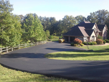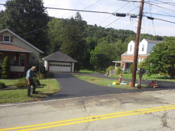 This photo is a job we did in Delmont, PA. The old driveway was washed out and in desperate need of being regraded and paved. We fine graded it before adding 2 inches of binder and 1.5 inches of top for a total of 3.5 inches compacted depth. You can see that we did the driveway in on 16′ wide pass so there is no seem down the middle of the driveway. The job turned out beautiful.